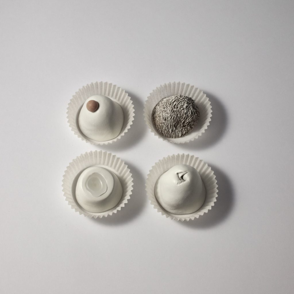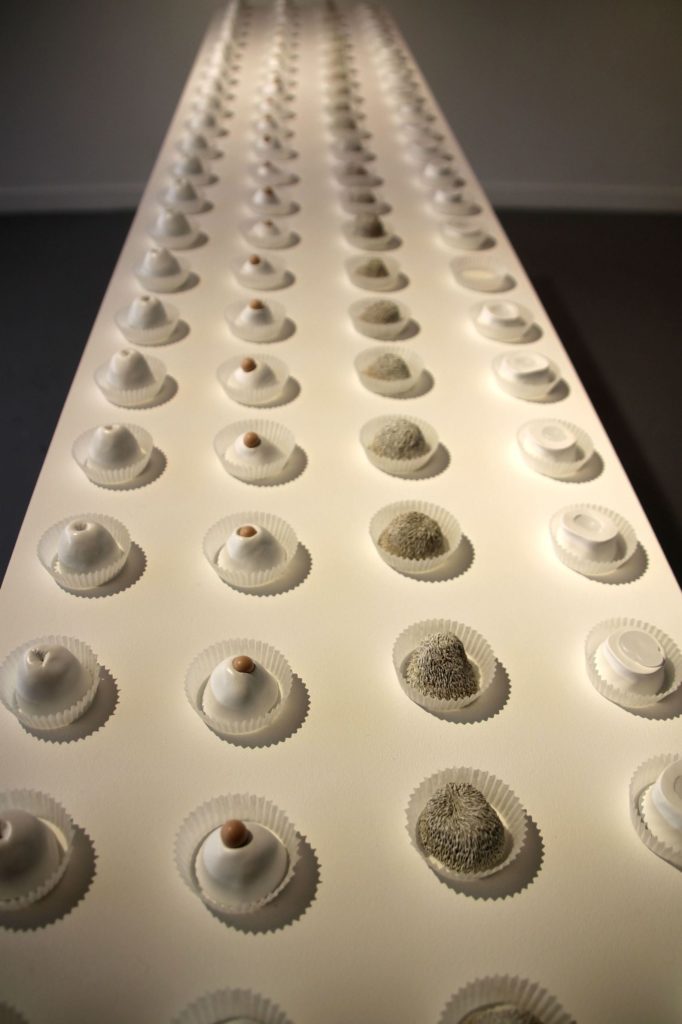 Mettant en évidence la variété de son talent et de ses savoir-faire, l’exposition d’Aurélie Amiot constitue un monde merveilleux dans lequel la pluralité des formes et des images n’est pas sans générer, en même temps qu’une évidente euphorie, une légère inquiétude. Voyez cet appétissant buffet de pâtisseries placé en guise d’accueil. Intitulé Mise en bouche, il semble pérenniser les fastes d’on ne sait quel banquet mythologique. Quelle belle promesse gourmande ! Malheur, pourtant, à qui serait tenté d’y planter la dent : ces petits gâteaux sont un leurre ; leur farine est de terre crue. Le palais enchanté de l’artiste n’est pas fait de pain d’épice et de sucre !