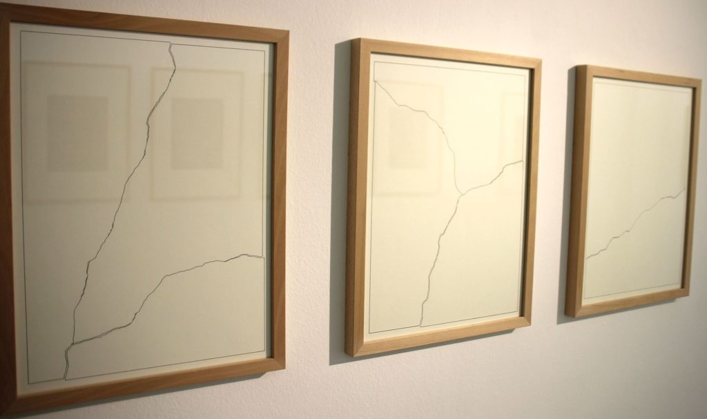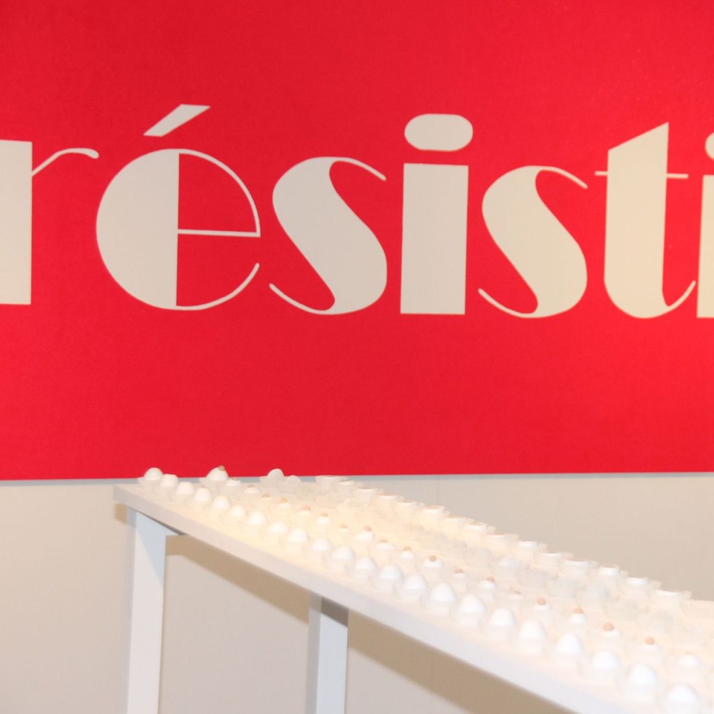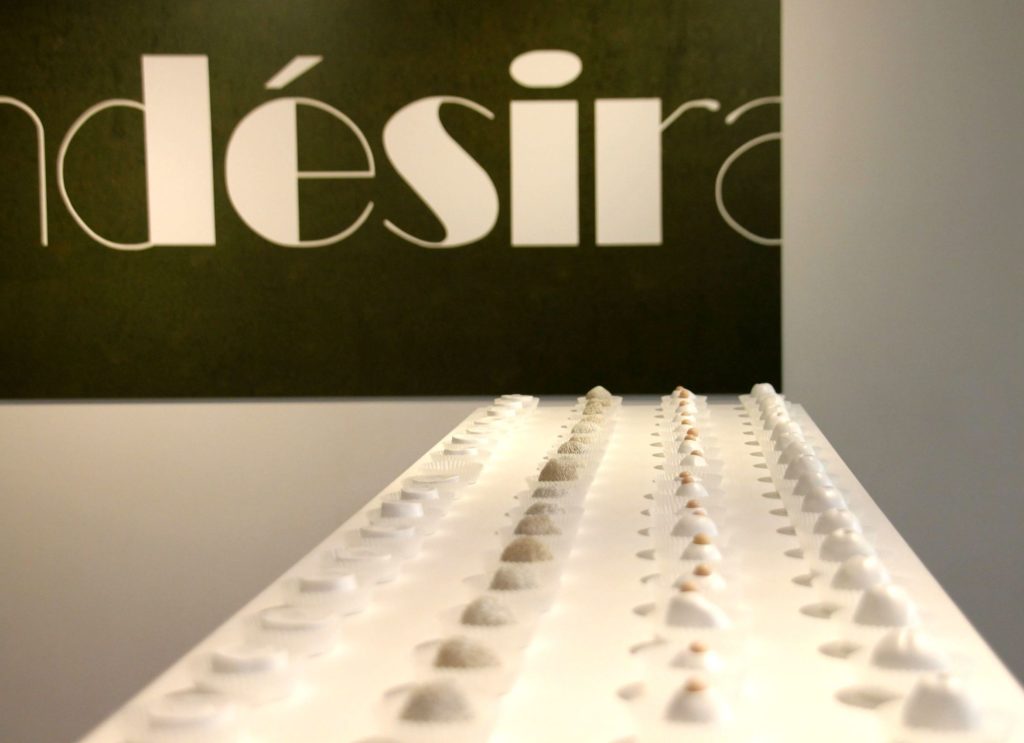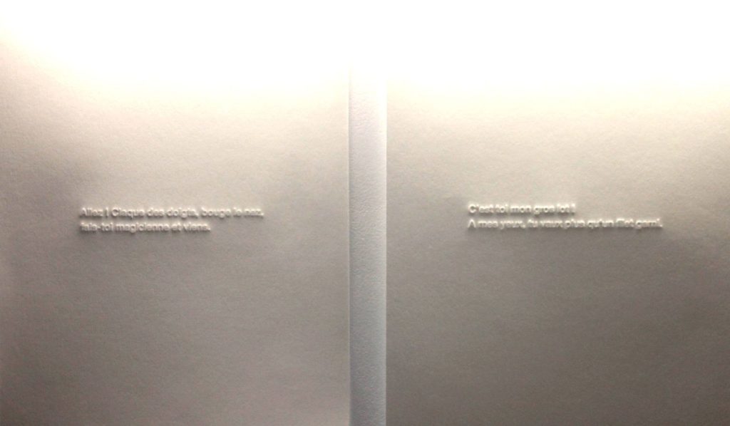Lorsqu’elle grave méticuleusement sur le linoléum le mot indésirable, Aurélie Amiot centre son attention sur le cœur du signifiant et c’est « désir » qui s’imprime dans l’œil du regardeur. De la même façon, les lettres « résist » s’échappent du carcan d’irrésistible. Freud a raison de dire que l’inconscient ne connaît pas la contradiction ; les images exposées ne disent pas autre chose. Dans ce jeu avec le langage, seules les polices sont policées. Comme ces caractères qui composent les mots doux de Correspondance : leur délicat relief est imprimé ou, plus exactement, gaufré, de manière à ne révéler son secret qu’à la faveur d’un jeu de lumière rasante.