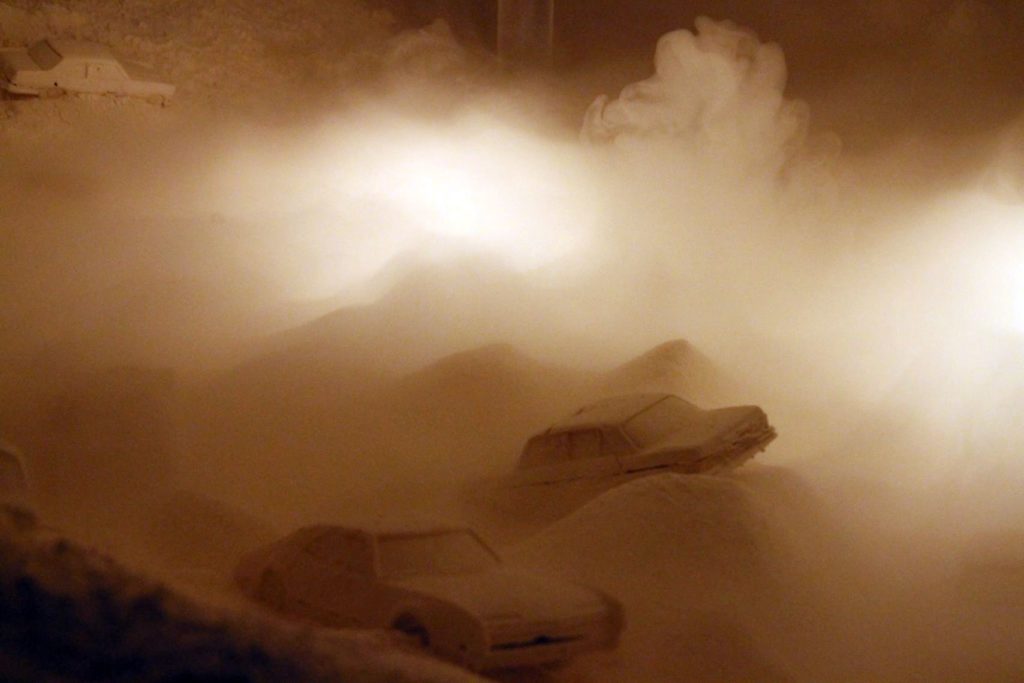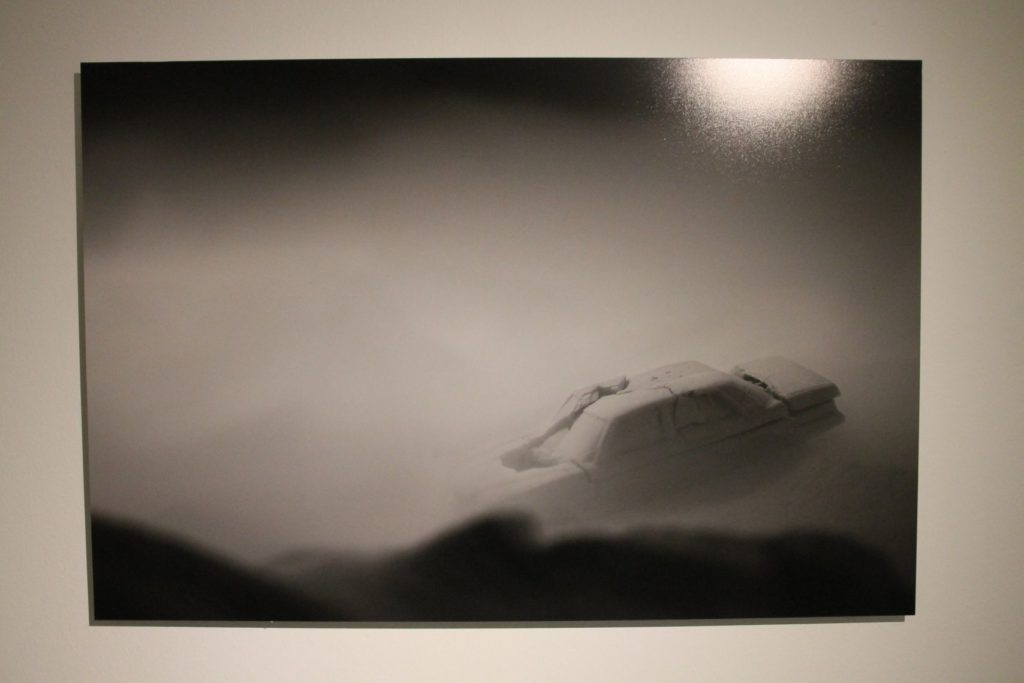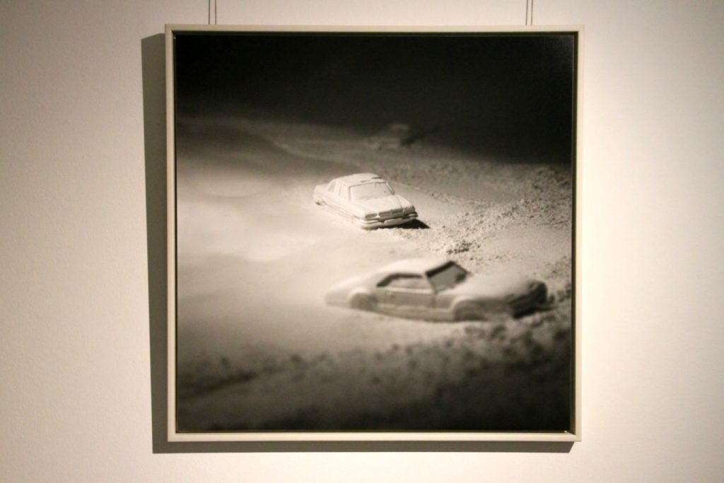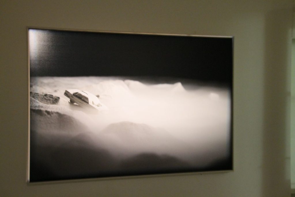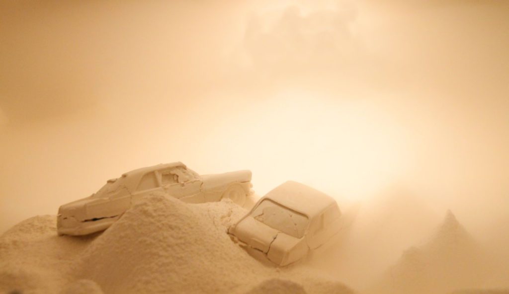 Il nous emmène dans un monde encore fumant et recouvert d’une épaisse poussière blanche. C’est après la catastrophe. Là comme des épaves échouées, de petites voitures blanches gisent, à moitié ensevelies. Ces voitures indifférenciées sont la dernière trace de l’homme et de son désir de dominer le monde.