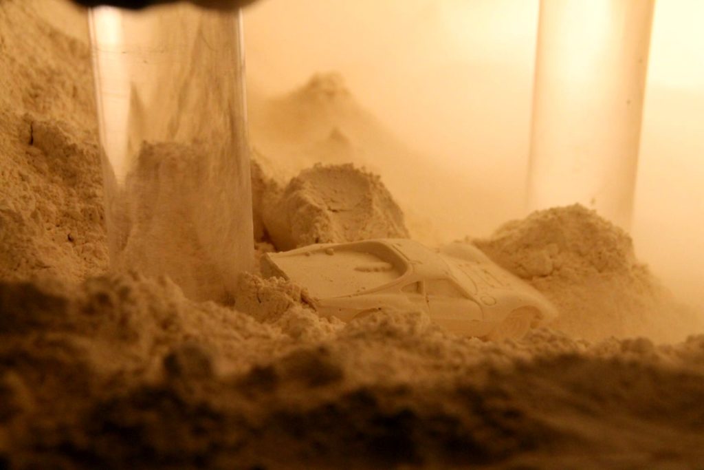 Dans ses installations errent des moulages de petites voitures ; des voitures anciennes qui nous ramènent à des temps oubliés et à une poésie enfantine. Elles sont comme des souvenirs ; parfois en parfait état, le plus souvent légèrement altérées par le temps, à demies enfouies dans le plâtre, plus tout à fait ce qu’elles étaient autrefois, voir quasi effacées…