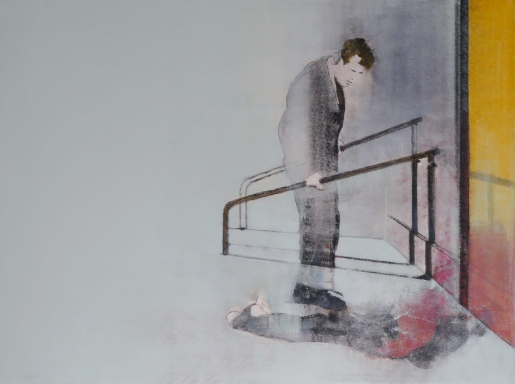 Points de suspension au-dessus du gouffre : Jérôme BOREL « peint des tableaux abstraits avec des motifs figuratifs » semblant légèrement s’évanouir dans le sfumato qui les aspire… Lorsque des personnages sont présents, ils semblent chercher quelque chose, une direction ou plutôt un sens, à l’intérieur même du tableau. Celui-ci nous donne la sensation d’observer un univers parallèle, un monde dans le monde, dont les règles logiques nous échappent. Nourri de références historiques, artistiques et littéraires, c’est parfois le titre des peintures qui nous apporte une clef de compréhension de l’espace qu’elles nous ouvrent.